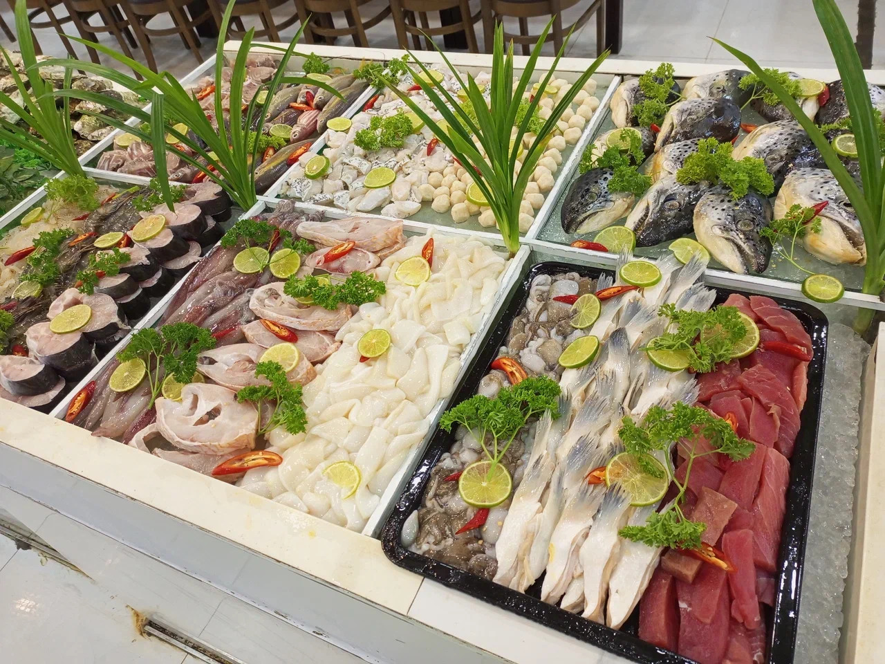 Ngon Gallery Nha Trang Restaurant. Еще один премиум-буфет в центре города, 2 этаж отеля Citadines Bayfront. Вход от 960 тыс. донгов, в билет включен лангуст по собственному рецепту ресторана, напитки и изысканные десерты. Можно прийти рано утром на завтрак – работают с 6:30. Кухня смешанная – морепродукты, азиатские и европейские блюда. Туристы всех национальностей отмечают высокий уровень сервиса, но сетуют на завышенные цены и не самые вкусные суши. Фишки ресторана: живая музыка, инстаграмность места, шоу-кухня, пекинская утка.